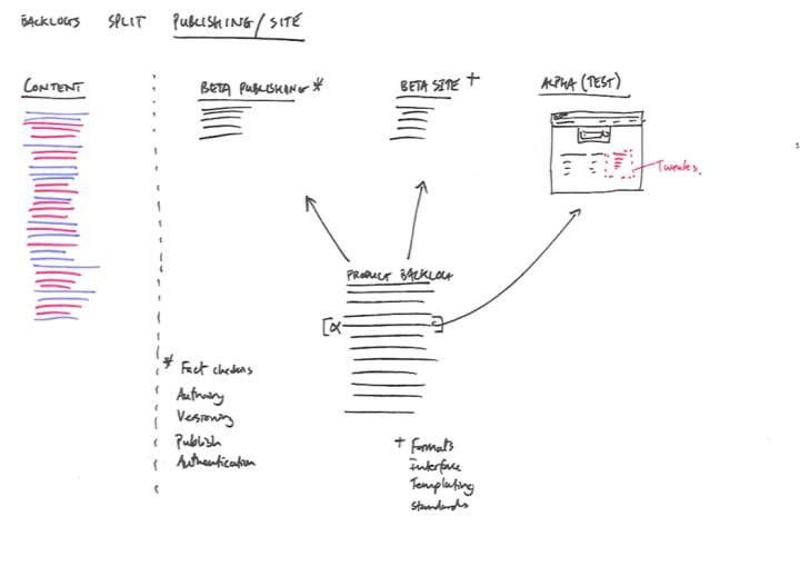 The publishing platform will allow our content designers to begin to work outside of our development team so we can focus on features and new content independently. In Alpha we had one product backlog, but in Beta we’ll have a product backlog and a content backlog.