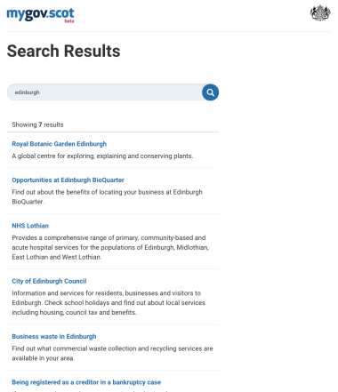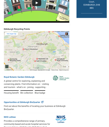 2. Rich nitro-boosted search – this gives us responsive search featuring maps, playable video, local authority phone numbers and deep links into sections within the site – all from search results. Edinburgh search results: Before