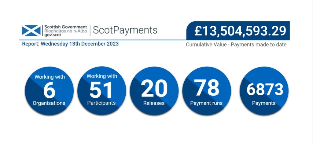 Since launching the minimal viable service in June 2022, we’ve continued to take an agile approach to the development of the platform and adoption of payments, starting small and allowing the service to scale over time. As of December 2023, ScotPayments has now processed over 6000 payments to the value of £13.5 million which will increase at pace as we continue to scale our platform.
