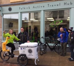 Noah says: “I was really excited to visit the Active Travel Hub. Minus the weather as it was super cold with much of Falkirk covered in snow! But that didn’t stop me! I met lots of people at the hub who were very helpful by providing expert knowledge! They showed me focal points for cycling and walking routes and told me about behavioural change initiatives to support and encourage people to choose active travel, particularly for shorter journeys. There is a lot of support available to the local community to help them make healthier and greener travel choices including sustainable modes of transport such as electric bikes or electric cars. I even got a shot of one of the bikes! And some yummy cake! Thank you to everyone who were all so friendly. What a worthwhile project!”