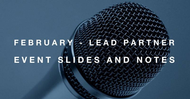 Due to the weather on 28 February our lead partner event was cancelled. A copy of the slides and notes from the lead partner event have been issued to all who signed up to attend. For those of you interested you can view the slides and corresponding notes here. Lead Partner Event – 28 Feb...