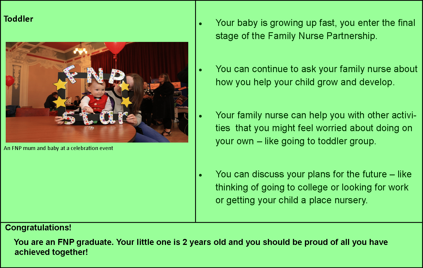 If you are a family nurse graduate or are currently receiving the programme, we would like you to help us plan a national celebration event please email: Family_Nurse_Partnership@scot.gov for more information.