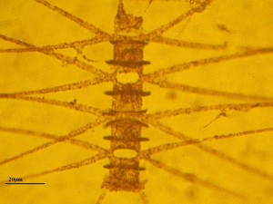 This is a chain of cells belonging to the diatom genus Skeletonema. They are one type of phytoplankton that are seen at the very onset of the spring bloom signalling that winter is over. As day length increases and the water column becomes more stable, conditions in the water become more favourable for phytoplankton growth.