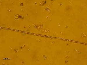 This is a chain of cells belonging to the genus Chaetoceros. These diatoms are very common in Scottish waters. On rare occasions when they are very abundant in the water, these spines can irritate the gills of farmed fish.