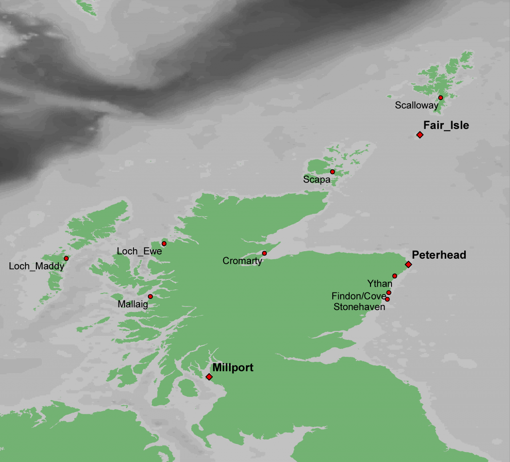 Location of coastal monitoring stations. The stations labelled in bold font are our longest time series. Millport dates back to 1909, Fair Isle dates back to 1979 and Peterhead dates back to 1977.