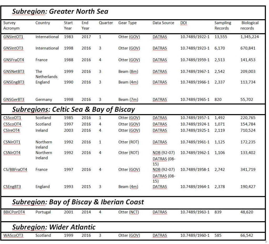 Marine Scotland Science has just released new Groundfish Survey Monitoring and Assessment data for the Northeast Atlantic Area, which includes fish abundance and biomass at length information for all the species caught during the surveys (details in the table below).