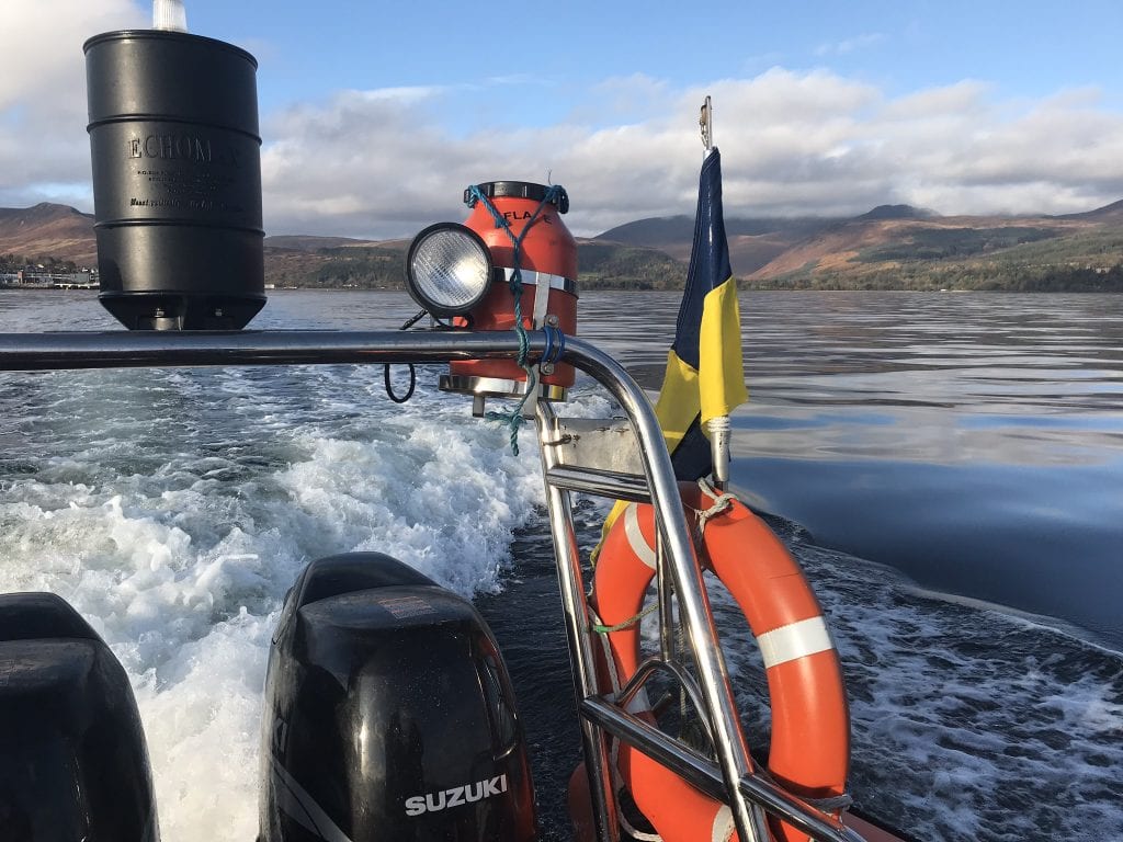 The trial is being undertaken by a Rigid Hulled Inflatable Boat (RHIB) called ‘Dignity’ (you’ll have that song stuck in your heads all day now…). During the spring to autumn months, Dignity (pictured right) is used by our colleagues in Marine Scotland Science, so it’s worked out well.