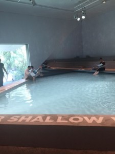 The opening of the new Australian Pavilion (designed by Denton Corker Marshall) was marked by an aboriginal welcome ceremony in which Iain Thorpe the Olympic gold-medal swimmer took part. This was very appropriate, given the Australian Pavilion contains a swimming pool as the centre-piece of an exhibition on the ‘pool’ and its impact on cultural identity in Australia.