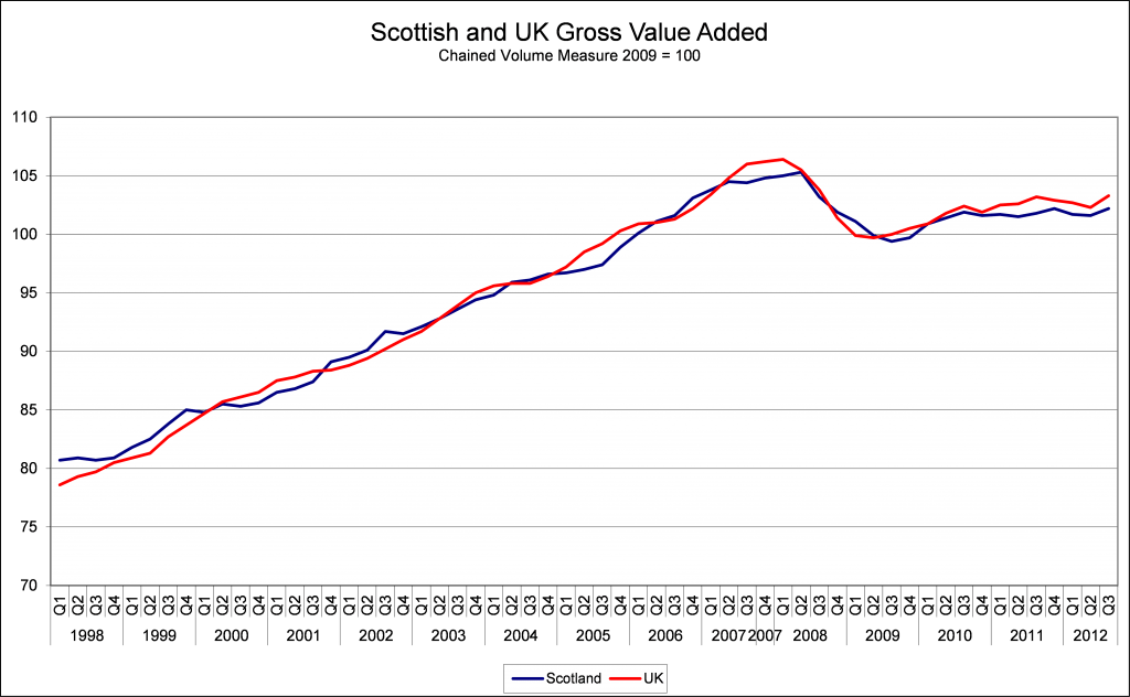 The most recent data for the Scottish economy showed welcome growth of 0.6% in the third quarter of 2012. This was encouraging as it appeared to reflect evidence of a degree of underlying strength in the economy. The UK figure was slightly stronger though this was influenced somewhat by the temporary impact of the Olympics which boosted growth to 1.0% in the same quarter.