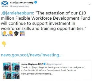 Business, Minister Jamie Hepburn announced that £10million will be invested to extend the Flexible Workforce Development Fund pilot. For more click here.