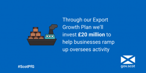 To support Scotland’s growing exports market, the First Minister announced that we will invest £20 million in an Export Growth Plan to help businesses ramp up overseas activity. The plan will increase financial support for companies looking to enter new markets and set up a new scheme that will create business-to-business peer mentorships for new exporters to learn from established exporters.
