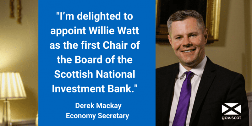 Economy Secretary Derek Mackay has welcomed the appointment of Willie Watt as the first Chair of the Board of the Scottish National Investment Bank. Mr Mackay said: “I’m delighted to appoint Willie Watt as the first Chair of the Board of the Scottish National Investment Bank. “The Bank has the opportunity to transform and grow...