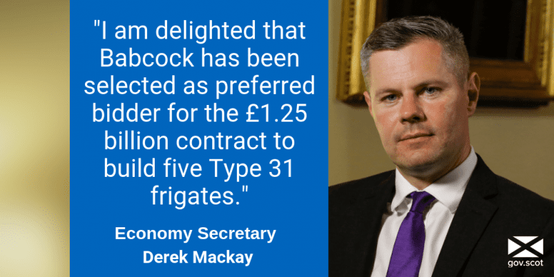 Commenting on Babcock being selected as preferred bidder for the £1.25 billion contract to build five Type 31 frigates, Economy Secretary Derek Mackay said: “I am delighted that Babcock has been selected as preferred bidder for the £1.25 billion contract to build five Type 31 frigates and look forward to working with them to maximise...