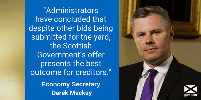 The Scottish Government has begun legal discussion with administrators to conclude the process of taking the Ferguson Marine shipyard into public ownership. Following a sale of business process, administrators have concluded that three indicative offers for the business received from commercial parties are either not capable of being executed or do not represent a better...