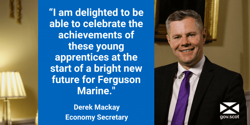 Economy Secretary Derek Mackay has attended a special ceremony to congratulate sixteen young men and women for completing their apprenticeships at Ferguson Marine shipyard. The special event in Greenock recognised and celebrated the apprentices’ contribution to work at the yard. The contract to take Ferguson Marine into public ownership was signed by the Scottish Government...